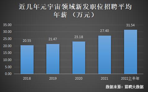 从新发职位招聘年薪来看,到 2022 年上半年,元宇宙领域新发职位人才的平均年薪达到了 31.54 万元,远高于 2021 年的 27.40 万元,而这相当于一个新手程序员奋斗 5-10 年才可以拿到的年薪,相比于 2021 年上半季度同比增长约 21%。